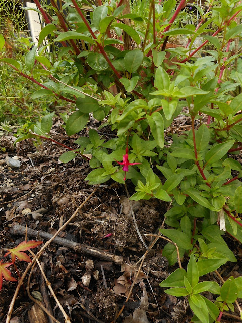 My first Fuchsia. This variety (I can't remember the name) has really tiny flowers. Not as tiny as F. 'Isis' but close. If you compare the blossom with the leaves, it will give you an idea of how small and cute it is.